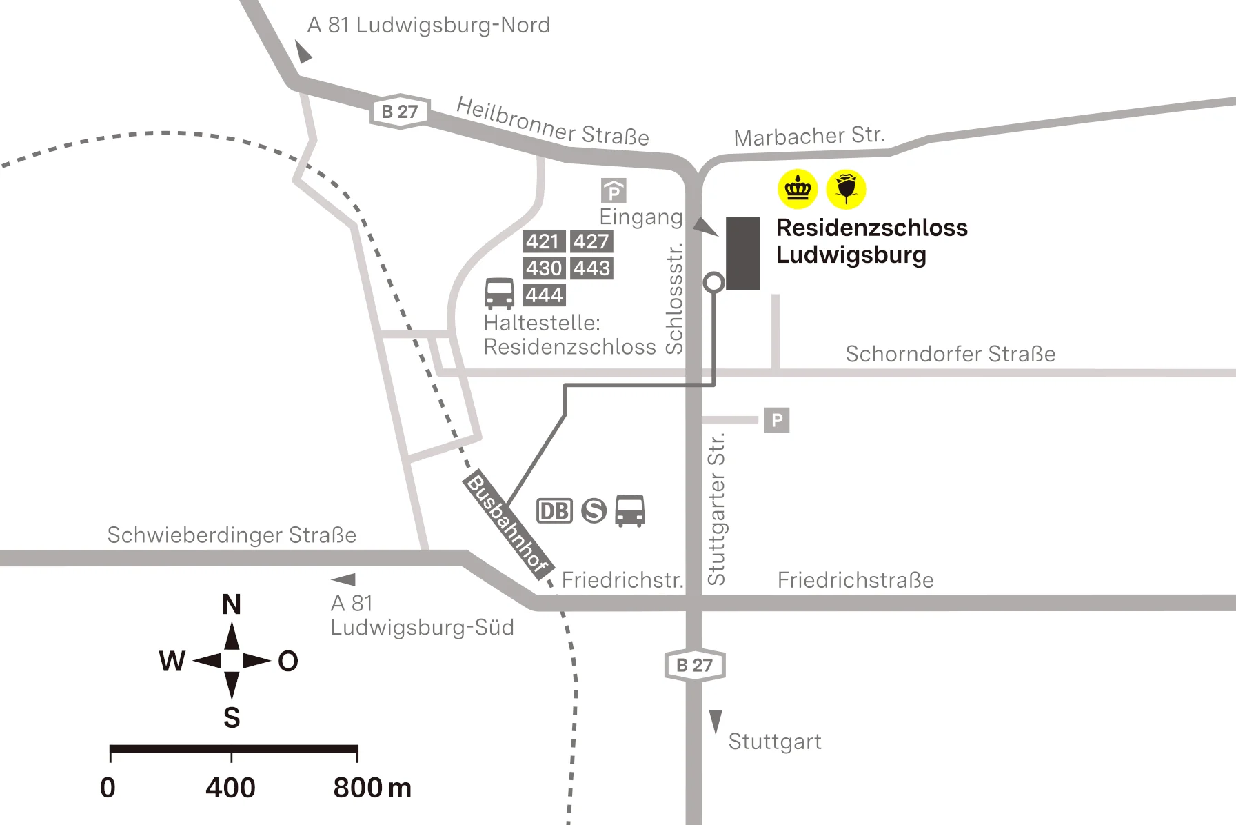ab Busbahnhof mit den Linien 421, 427, 430 oder 444 bis Haltestelle Residenzschloss;