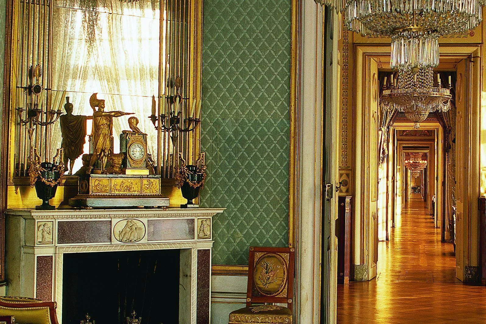 Rechts im Bild: aufeinander abgestimmte Uhr und Leuchter stehen auf einem Kamin.
