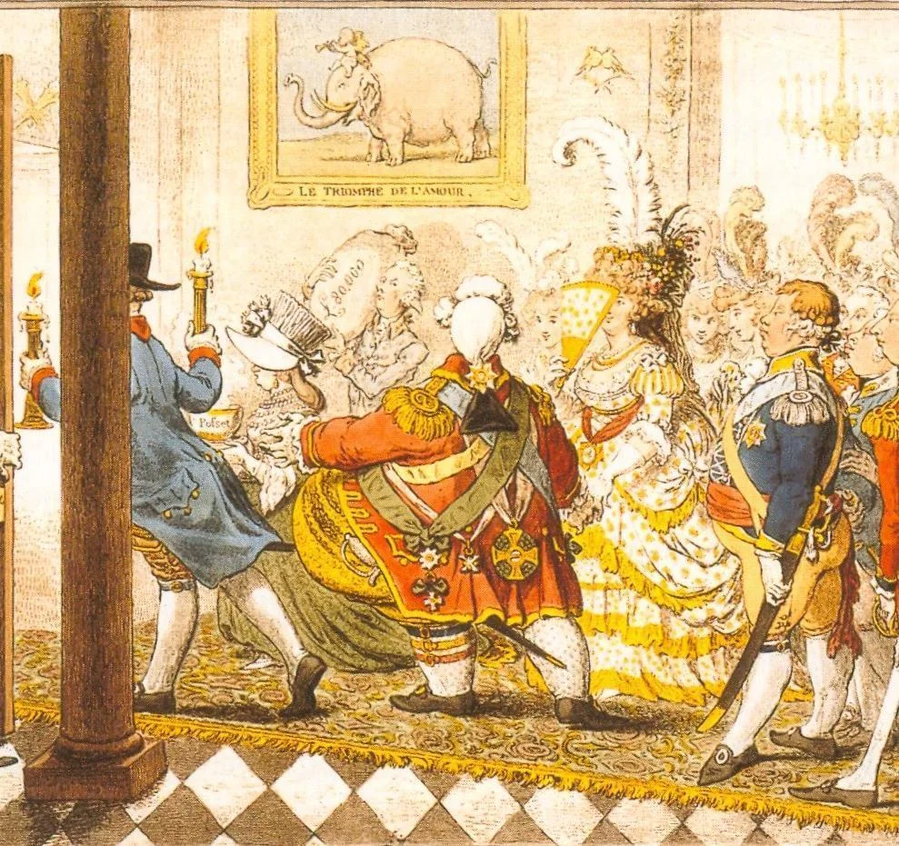 Karikatur zur Vermählung Friedrichs von Württemberg mit Charlotte Auguste Mathilde von England, The Bridal Night, James Gillrays, Radierung und Aquatinta, 1797